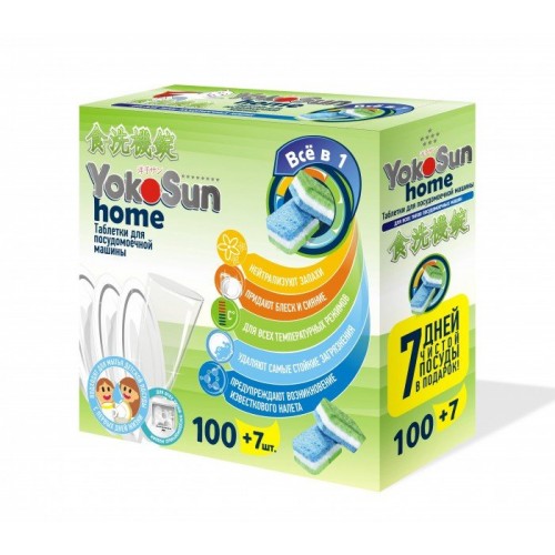 Таблетки для посудомоечной машины YokoSun. Специально разработаны для домашних посудомоечных машин всех типов. Эффективно и деликатно удаляют самые стойкие загрязнения при любых температурных режимах, не оставляя разводов на поверхности посуды и неприятного запаха. Одна таблетка включает в себя все функции таблеток All in 1.