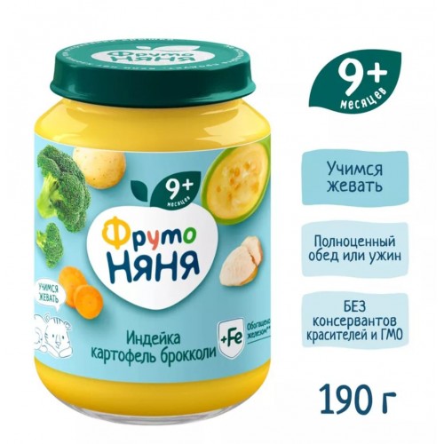 Мясо-растительное пюре ФрутоНяня «Индейка, картофель, овощи» (190 г) предназначено для питания детей с 9 месяцев. Это полноценный обед, который помогает ребенку переходить к более сложным вкусам и текстурам (в составе могут присутствовать мелкие кусочки для стимулирования навыков жевания).