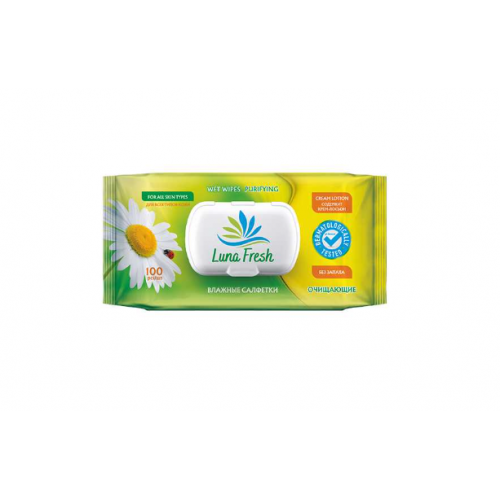 ОЧИЩАЮЩИЕ ВЛАЖНЫЕ САЛФЕТКИ LUNA FRESH Cалфетки пропитаны экстрактом ромашки, который снимает воспаление и раздражение кожи. Он обладает нежной нелипкой и нежирной текстурой, поэтому не оставляет следов и неприятных ощущений. Снабжена крышкой, обеспечивающей герметичность и возможность многократного открывания/закрывания. В упаковке 100 шт