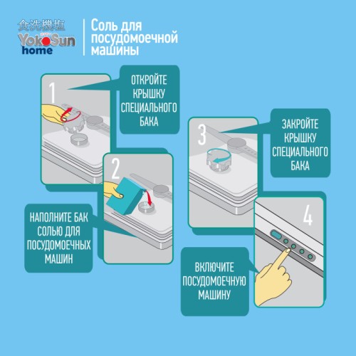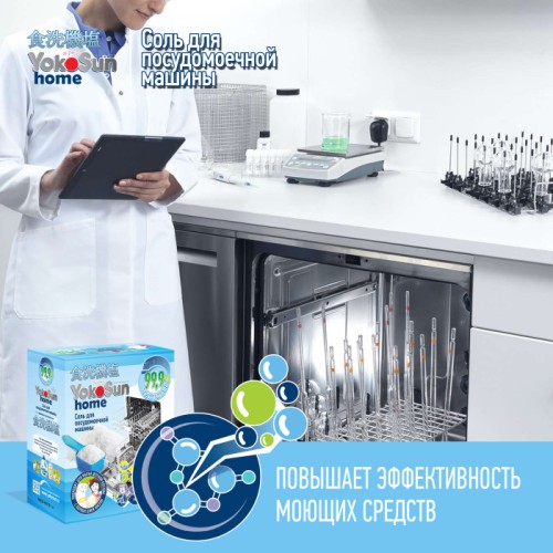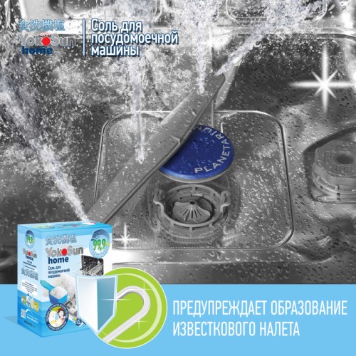 Соль для посудомоечной машины YokoSun. Специально разработана для домашних посудомоечных машин всех типов. Особая формула эффективно смягчает воду, предотвращая образование накипи и известкового налета. Обеспечивает экономичный расход и повышает эффективность моющих средств для посудомоечных машин.