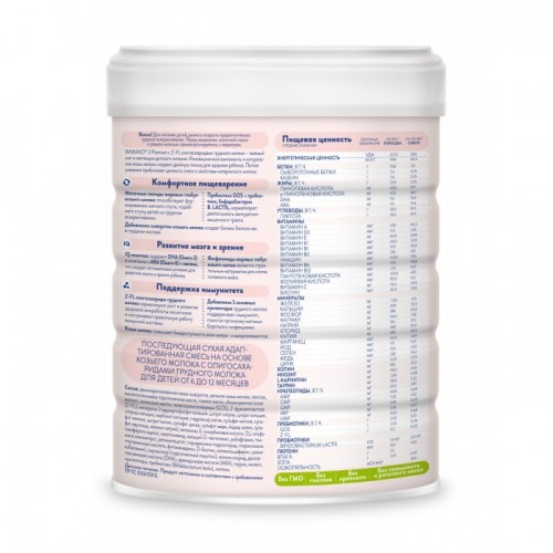 "лактоза, обезжиренное козье молоко, цельное козье молоко, высокоолеиновое подсолнечное масло, соевое масло, кокосовое масло, галактоолигосахариды (GOS), 2'-фукозиллактоза (2'-FL), мальтодекстрин, минералы (цитрат кальция, карбонат кальция, цитрат натрия), гидроортофосфат кальция, гидроксид калия, сульфат железа, сульфат цинка, сульфат меди, йодид калия, сульфат марганца, селенит натрия), витамины (L-аскорбиновая кислота, D,L-альфа-токоферола ацетат, никотинамид, D-пантотенат кальция, рибофлавин, тиамина мононитрат, ретинилацетат, пиридоксина гидрохлорид, птероилмоноглутаминовая кислота, фитоменадион, D-биотин, холекальциферол, цианокобаламин), эмульгатор (подсолнечный лецитин), холина хлорид, докозагексаеновая кислота (DHA), арахидоновая кислота (ARA), инозит, таурин, пробиотики (Bifidobacterium lactis), лютеин.